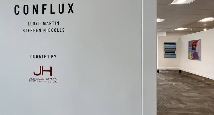 Hagen chose the name of the exhibition, CONFLUX, as it means a coming together, a confluence of Martin’s and Niccolls’ work. “To my eye, their paintings are a natural pairing,” says Hagen. “Both artists are highly skilled colorists creating compelling non-representational compositions. Martin’s work employs the use of straight lines to wrangle, define and convey areas of color, while Niccolls makes use of curvilinear shapes to do the same. The juxtaposition of these two stylistic approaches is exciting, uplifting, and energizing for the viewer.”